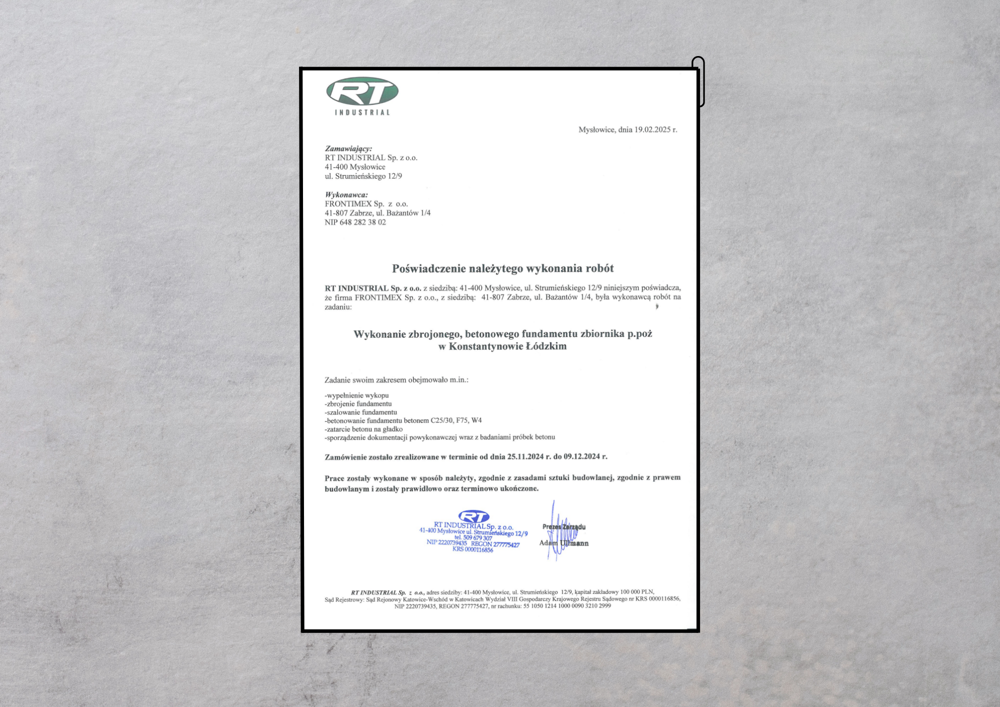 Frontimex to firma budowlana, specjalizująca się w zaawansowanych konstrukcjach, wzmacnianiu i modernizacji obiektów przemysłowych oraz ochronnych.